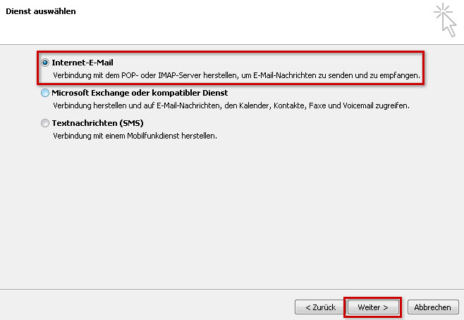 Wählen Sie nun die Option Internet-E-Mail aus und klicken Sie dann auf Weiter ! |
